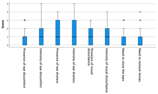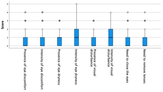 At the same time, in our study it was found that 5.6% and 3.3% of the subjects presented occasional and frequent symptoms of visual disturbances, respectively. These results are similar to those of the study by Rahmawaty Lubis et al. [30] and far lower than those recorded in the studies by Mohamad Daud et al. [31] and Sapkota et al. [32]. However, both studies found that these symptoms increased with the use of digital devices; therefore, it could be interesting to consider this point in future studies involving daily-CL wearers to determine the reason for the difference in the symptoms of blurry vision.