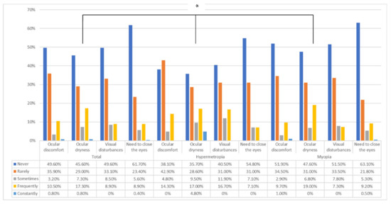 Figure 3 shows the presence of ocular symptoms depending on the refractive state (emmetropic participants were excluded due to the small sample size).
