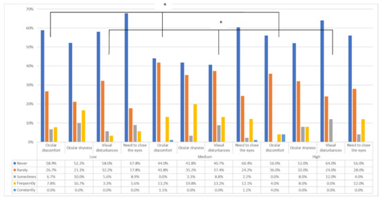 Symptomatology presence according to the degree of myopia. Low: −0.5D < SE > −3D; medium: −3D ≤ SE > −6D; high: SE ≤ −6D. * Significant differences (p < 0.05).
