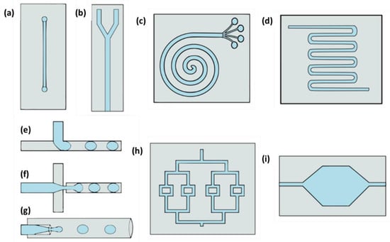 Types of microfluidic devices channel configurations: (a) straight, (b)”Y” shaped, (c) spiral, (d) serpentine, (e) “T”-junction, (f) cross-junction, (g) flow-focusing, (h) division, and (i) microchamber.