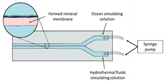 As an approach to studying chemical gardens more easily, Batista and Steinbock [72] created microfluidic devices for mineral membrane precipitation. Such devices are fabricated with low-cost materials such as acrylic, Parafilm®, polystyrene, glass, or Teflon®. Fabrication of microfluidic devices for mineral precipitation is simple; for example, a cut Y-pattern parafilm is sandwiched between two acrylic sheets with drilled inlets. Barb fittings are glued to the perforations to connect the tubing [72]. The Y-shaped channel configuration (Figure 2) permits the flux of two parallel streams without mixing. Although the streams do not mix, they are in contact with each other, allowing the creation of conditions far from equilibrium (pH, temperature, and concentration gradients) [45]. For instance, Möller et al. [73] prove the existence of pH gradients up to six units at micrometric scales in the microfluidic device channel.