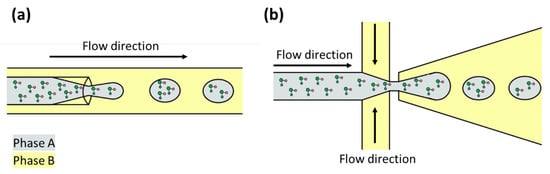 Encapsulation of molecules with droplet-based microfluidic devices. Phases A and B are immiscible liquids. (a) Flow-focusing geometry. (b) Cross-junction geometry.