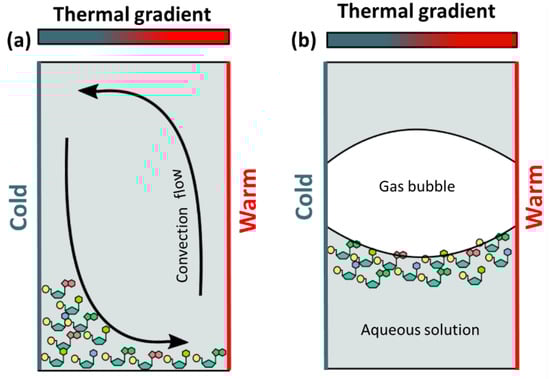 Accumulation of molecules in thermal traps: (a) thermal trap filled with an aqueous solution: molecules accumulated in the bottom of the capillary (by gravitational forces) and on the cold side (by convection induced by the thermal gradient); (b) thermal trap filled with an aqueous solution and gas: molecules tend to accumulate at the gas–water interface.