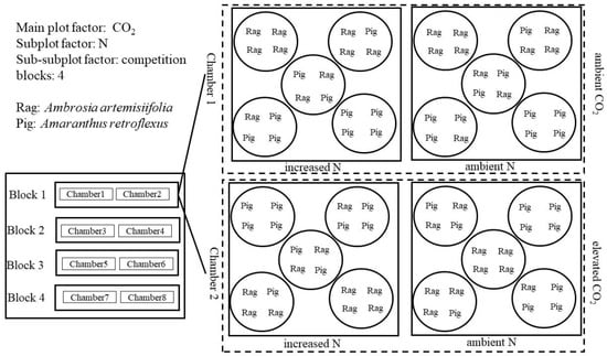Four seedlings were planted in each pot under the replacement design: 4Rag:0Pig, 1Rag:3Pig, 2Rag:2Pig, 3Rag:1Pig, and 0Rag:4Pig (where Rag and Pig denote common ragweed and redroot pigweed, respectively). Two N levels, and five replacement levels within each N level, produced 10 pots in each chamber. Thus, 80 pots (32 cm in diameter and 38 cm in depth) were randomly arranged within 8 OTC in the following experimental design: 2 CO2 levels × 2 N levels × 5 replacement levels × 4 replicates (Figure 1). During the growing season, N was equally divided eight times and uniformly applied in the form of NH4NO3 solution, while the control pots were sprayed with the same volume of water.