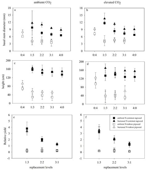 Results revealed that height and basal stem diameter of common ragweed were significantly enhanced by increased N in both monoculture and mixtures under both CO2 concentrations (p < 0.001) (Figure 2a–d; Table 1). At the same time, increased N enhanced (p < 0.05) the height and basal stem diameter (p < 0.001) of redroot pigweed.