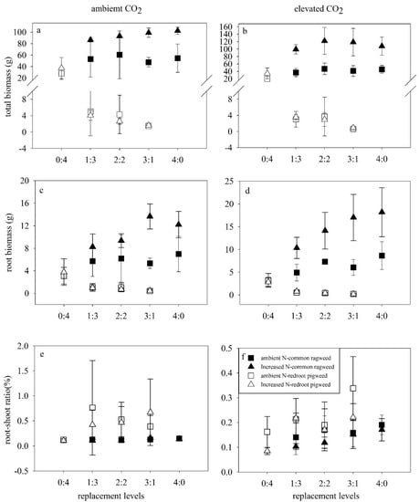 Effects of elevated CO2 (ambient CO2, left; elevated CO2, right), N addition and replacement levels on the biomass of two invasive alien plants. Bars show mean ± SD (4). (a,b). Total biomass. (c,d). Root biomass. (e,f). Root–shoot ratio. On the horizontal axis, 1:3 refers to one common ragweed plant and three redroot pigweed plants, 2:2 refers to two common ragweed plants and two redroot pigweed plants, 3:1 refers to three common ragweed plants and one redroot pigweed plant, and 0:4 and 4:0 refer to four redroot pigweed plants or four common ragweed plants, respectively.