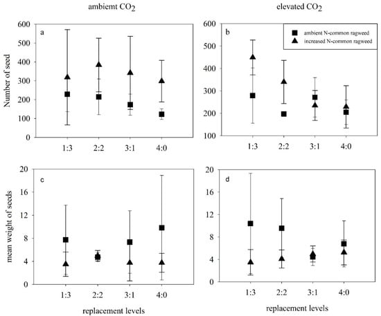 Effects of elevated CO2, N addition and replacement levels on the reproductive characteristics of common ragweed. Bars show mean ± SD (4). (a,b) The number of seeds (c,d) mean weight of seeds. On the horizontal axis, 1:3 refers to one common ragweed plant and three redroot pigweed plants, 2:2 refers to two common ragweed plants and two redroot pigweed plants, 3:1 refers to three common ragweed plants and one redroot pigweed plant, and 4:0 refers to four common ragweed plants.