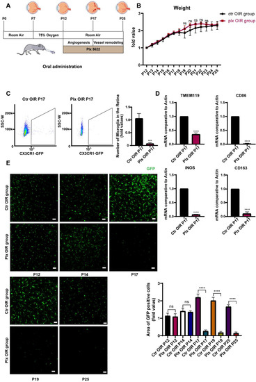 PLX5622 administration effectively removed microglia in the retina. (A) Natal mice were placed in an oxygen box with 75% (±2%) from P7 to P12 to establish the OIR model, then were switched to room air at P12. They were subjected to oral administration of PLX5622 from P12 to P25. (B) The weights of mice in the two groups were tested each day (n = 3 per group). (C) Retina samples were collected from the OIR and Plx groups on P17. The expression of CX3CR1 (green, GFP) on MG was analyzed by FACs (n = 3 per group). (D) mRNA expression of microglia (TMEM119), M1 subtype-related genes (iNOS, CD86), and M2 subtype-related genes (CD163) were determined by qRT-PCR (n = 3 per group). (E) Immunofluorescence staining of CX3CR1 (GFP, green) in the retinas of CX3CR1-GFP mice were collected on P12, 14, 17, 19, and 25 (n = 3 per group). Scale bar, 100 µm. Bars = means ± SD; *** p < 0.001; **** p < 0.0001; NS, no significance.