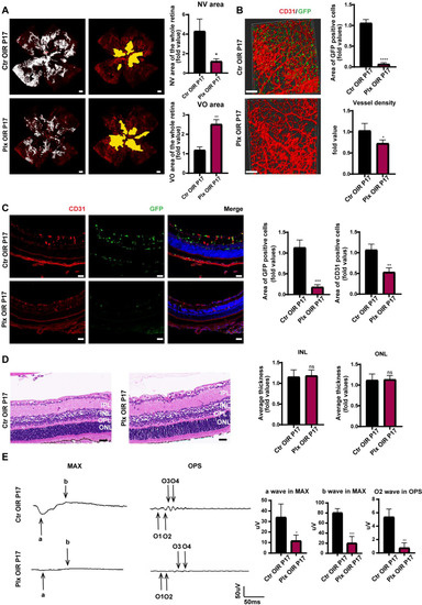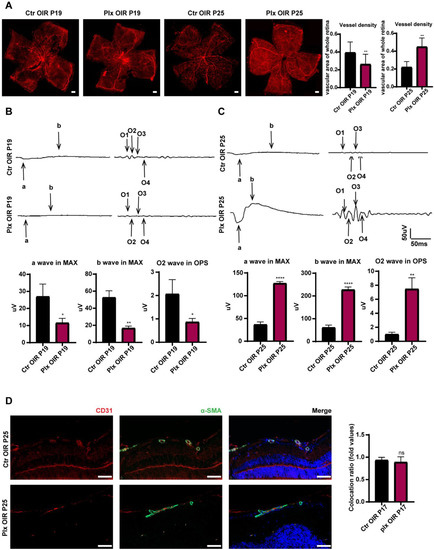 Microglia depletion on P25. (A) The whole retinas of CX3CR1-GFP mice were collected on P19 and P25. CD31 was stained with red (n = 3 per group). Scale bar, 200 µm. MAX wave and OPS wave in ERG were tested on P19 (B) and P25 (C). (D) Immunofluorescence staining of CD31 (red), α-SMA (green), and DAPI (blue) on P25 in both Ctr OIR and PLX OIR groups. Scale bar, 100 µm (n = 3 per group). Bars = means ± SD; * p < 0.05; ** p < 0.01; **** p < 0.0001; NS, no significance.