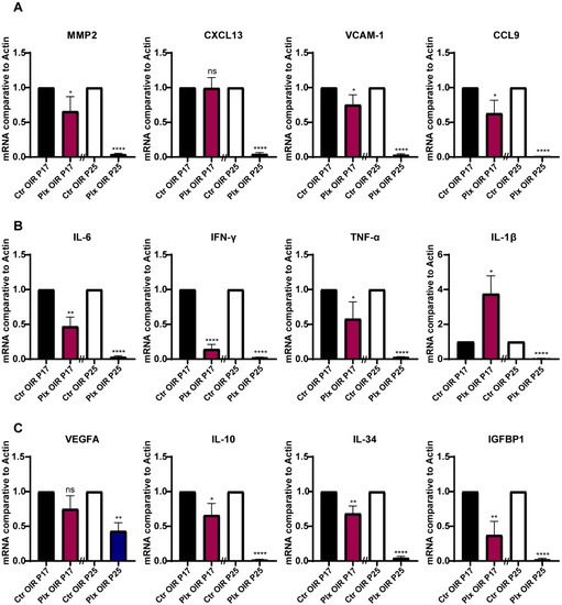Expression of cytokines in the OIR and PLX groups on P17 and P25. (A–C) mRNA expression of the cytokines associated with adhesion (MMP2, CXCL13, VCAM-1, and CCL9), inflammation (IL-6, IFN-γ, TNF-α, and IL-1β), and angiogenesis (VEGFA, IL-10. IL-34, and IGFBP1) were determined by qRT-PCR (n = 3 per group). Bars = means ± SD; * p < 0.05; ** p < 0.01; **** p < 0.0001; NS, no significance.
