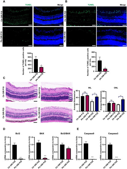 The apoptosis declined after microglial depletion on P25. (A,B) Immunofluorescence staining of TUNEL (green) and DAPI (blue) on P25 in both the Ctr OIR and PLX OIR groups (n = 3 per group). Scale bar, 100 µm. (C) HE staining of retinas in the Ctr OIR and PLX OIR groups (n = 3 per group). Scale bar, 100 µm. (D,E) mRNA expression of apoptosis-associated genes were determined by qRT-PCR (n = 3 per group). Bars = means ± SD; * p < 0.05; ** p < 0.01; *** p < 0.001; **** p < 0.0001; NS, no significance.