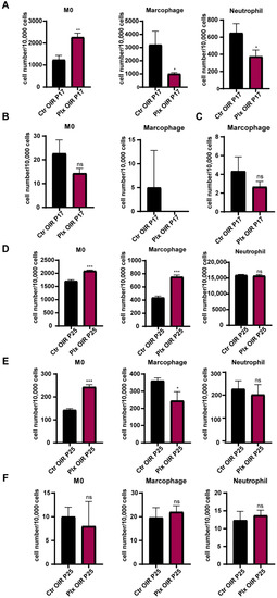 To explore the effects of PLX5622 gavage on the mobilization of bone marrow cells and the role myeloid cells played in the changes above, flow cytometry was used to analyze the cells from bone marrow, peripheral blood, and retina of the OIR and PLX mice on P17 and P25, respectively. The results showed that on P17, the number of CD45 + CD11b + LY6Chigh monocytes increased significantly in bone marrow, while the number of CD45 + CD11b + LY6G + neutrophils and CD45 + CD11b + F4/80 + macrophages produced by bone marrow decreased significantly (Figure 6A). The specific gate in anchoring myeloid cells is shown in Figure S4. In the peripheral blood (Figure 6B) and retina (Figure 6C), the number of monocytes tended to decrease, while the number of neutrophils and macrophages could be ignored on P17, which was consistent with the previous study [35]. The neutrophils were not detected in peripheral blood, while M0 and neutrophils were not detected in retina in both the Ctr and PLX groups on P17. It might be because the immune cells had not yet fully distributed to the whole body. On P25, monocytes and macrophages in bone marrow increased significantly after microglial depletion, and the change of neutrophils was not significant (Figure 6D). Monocytes in blood also increased obviously, which might be caused by the migration of the increased number of monocytes in bone marrow to the peripheral blood. Meanwhile, macrophages and neutrophils in peripheral blood had a tendency to decrease, but there was no significant difference (Figure 6E). There was also no obvious difference in the number of myeloid cells in the retina of mice on P25 (Figure 6F). Previous studies [35,36] have shown that the pathological process of the OIR model did not affect the turnover rate of myeloid cells in the retina [35]. Our study showed that removing microglia by PLX5622 did not significantly affect the recruitment of myeloid cells in the retina, but it interfered with the proportion of myeloid cells in the bone marrow. The change could be manifested in the peripheral blood after a period of accumulation.