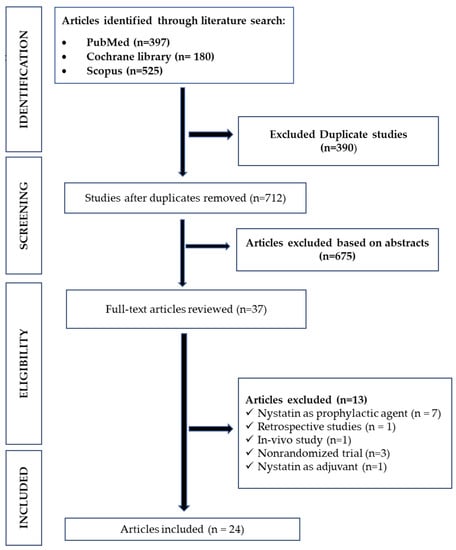 After screening, three hundred ninety duplicate studies and six hundred seventy-five irrelevant studies were removed. On the basis of the eligibility criteria, thirteen studies were excluded: seven studies with nystatin as prophylactic agent, three nonclinical studies, one retrospective, one in vivo study, and one study with nystatin as adjuvant.