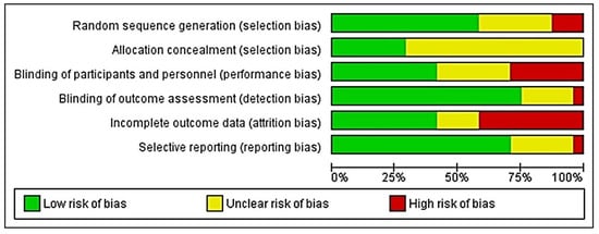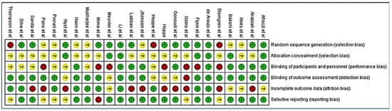 Only two of the included studies met all the seven assessment criteria [34,35]. Most studies were found to have an unclear risk of selection, performance and attrition bias, and a moderate risk of other biases. The overall risk of each bias is presented in Figure 2, and the risk of each bias in each of the studies separately is presented in Figure 3. A 100% agreement was achieved on study quality among the reviewers.
