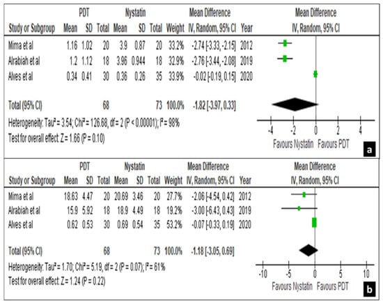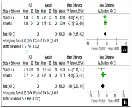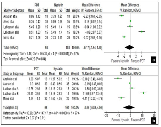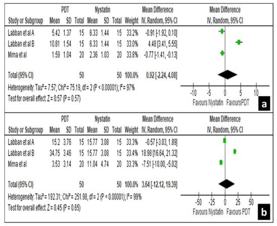 Forest plot comparing the efficacy of nystatin and PDT on palatal mucosa (a) and denture surface (b) in 15 days.