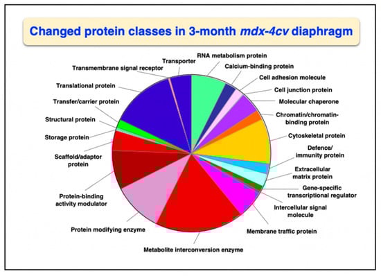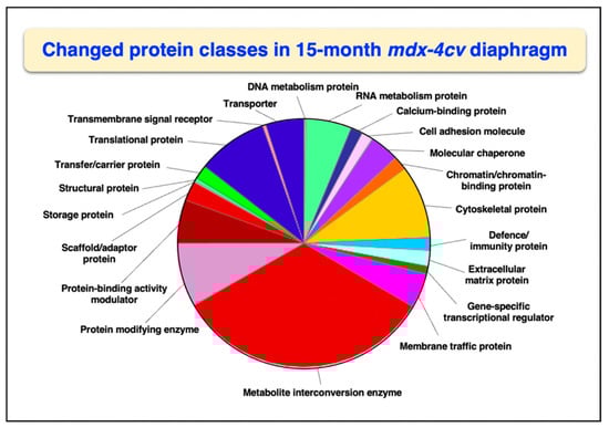 Bioinformatic analysis of changed protein classes in 15−month old mdx-4cv diaphragm muscle. The analysis was carried out with the PANTHER program [99].