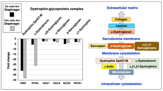 Proteomic analysis of the expression of the dystrophin-glycoprotein complex in 3−month (3 m, black bars) versus 15−month (15 m; grey bars) old mdx-4cv diaphragm muscle. On the left is shown a bar diagram of the fold change in abundance of representative members of the dystrophin-glycoprotein complex, as determined by comparative proteomics. Identified proteins included Dystrophin (DMD), α/β-Dystroglycan (DAG1), α-Sarcoglycan (SGCA), β-Sarcoglycan (SGCB), α-Dystrobrevin (DTNA) and α1-Syntrophin (SNTA1). On the right side is shown a diagrammatic presentation of the dystrophin-glycoprotein complex [20].