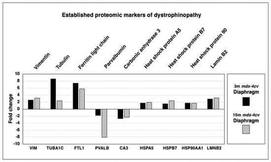 In order to put this new study into perspective, a variety of established proteomic markers of X-linked muscular dystrophy were analyzed. As shown in Figure 4, increases in the intermediate filament component vimentin (VIM), the microtubular protein isoform tubulin-alpha-1c (TUBA1C), the intracellular iron regulatory protein ferritin light chain (FTL1), heat shock protein A5 (HSPA5), small heat shock protein B7 (HSPB7), large heat shock protein 90AA1 (HSP90AA1) and nuclear lamin isoform B2 (LMNB2) were confirmed. Characteristic decreases were established for the cytosolic calcium-signaling protein parvalbumin (PVALB) and the metalloenzyme carbonic anhydrase isoform 3 (CA3).