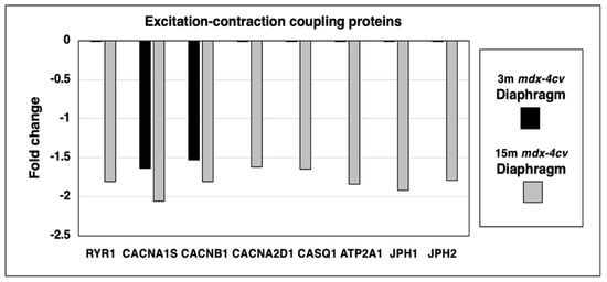 Proteomic identification of changes in the expression levels of key proteins involved in excitation-contraction coupling, calcium homeostasis and triad integrity in 3−month (3 m, black bars) versus 15−month (15 m; grey bars) old mdx-4cv diaphragm muscle. This included the Ryanodine receptor calcium-release channel (RYR1), the voltage-sensing L-type calcium channel with its α1S-subunit (CACNA1S), β1-subunit (CACNB1) and α2/δ-subunits (CACNA2D1), fast Calsequestrin (CASQ1), the fast SERCA1 Calcium-ATPase (ATP2A1), Junctophilin 1 (JPH1) and Junctophilin 2 (JPH2).