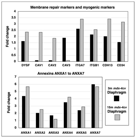 A protein of central importance in the calcium-dependent membrane repair process of damaged skeletal muscles is dysferlin (DYSF). The mass spectrometric survey of wild type versus mdx-4cv diaphragm preparations revealed an increase of this sarcolemmal repair protein. Since the dysferlin/myoferlin system closely interacts with caveolins and annexins, the expression levels of these crucial components of the caveolae structures and calcium regulation, respectively, were also examined. The concentration of caveolin 1 (CAV1) and caveolin 2 (CAV2) increased drastically in aged and dystrophic diaphragm, while the muscle-specific caveolin-3 (CAV3) isoform showed elevated levels in 3-month old mdx-4cv diaphragm but only marginal changes in 15-month old dystrophic muscles. Integrins are useful markers of proliferation and the main type present in the skeletal muscle periphery, α7β1-integrin (ITGA7/ITGB1), was identified to be increased in both young and aged mdx-4cv diaphragm. Interestingly, the expression of the myogenic markers cadherin-13 (CDH13) and CD34 were both elevated in muscular dystrophy.