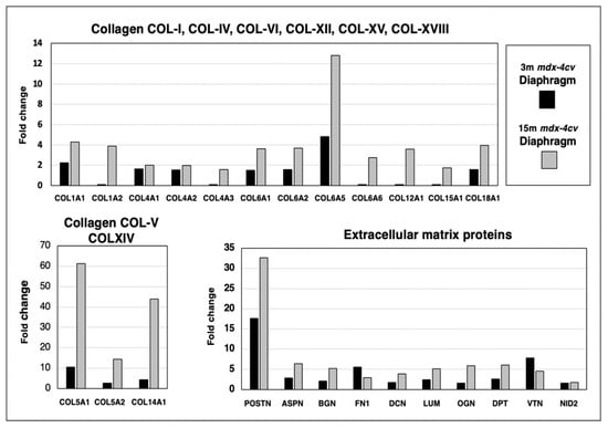 Skeletal muscles contain a considerable number of collagen isoforms and its extracellular matrix is formed by a highly complex mesh of diverse proteins. The comparative proteomic analysis of 3-month versus 15-month old mdx-4cv diaphragm muscle revealed increases in collagen I (COL1A1 and COL1A2 chains), collagen IV (COL4A1, COL4A2 and COL4A3 chains), collagen V (COL5A1 and COL5A2 chains), collagen VI (COL6A1, COL6A2, COL6A5 and COL6A6 chains), collagen XII (COL12A1 chain), collagen XIV (COL14A chain), collagen XV (COL15A1 chain) and collagen XVIII (COL18A1 chain), as shown in Figure 7. Increased levels of crucial extracellular matrix proteins were identified in the case of the matricellular protein periostin (POSTN), the small leucine-rich proteoglycans asporin (ASPN), biglycan (BGN), lumican (LUM) and mimecan/osteoglycin (OGN), the adhesive glycoprotein fibronectin (FN1), the proteoglycan decorin (DCN), the tyrosine-rich acidic matrix protein dermatopontin (DPT), the hemopexin-type glycoprotein vitronectin (VTN) and the basal lamina component nidogen-2/osteonidogen (NID2). The most drastic differences in the degree of increased expression levels between young versus aged mdx-4cv diaphragm were found for the collagen chains COL5A1, COL5A2, COL6A5 and COL-XIV, as well as the matricellular protein periostin (Figure 7).