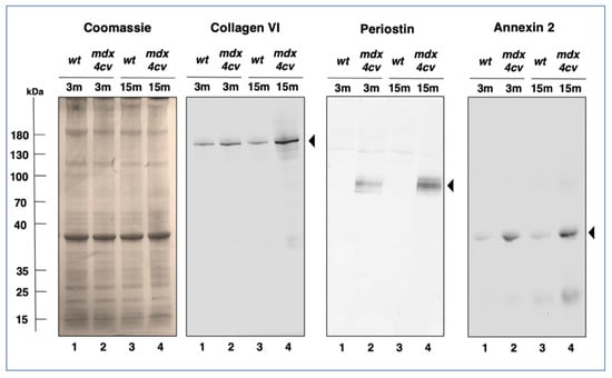 Coomassie Blue staining of one-dimensionally separated diaphragm proteins revealed no major differences in the band pattern of 3-month versus 15-month old wild type versus mdx-4cv diaphragm preparations. However, immunoblotting with antibodies to collagen COL-VI, periostin and annexin isoform ANXA2 clearly showed a significant increase of these proteins in dystrophic diaphragm muscle. Both, collagen and periostin exhibited high expression levels in aged and dystrophin-deficient muscles (Figure 8).