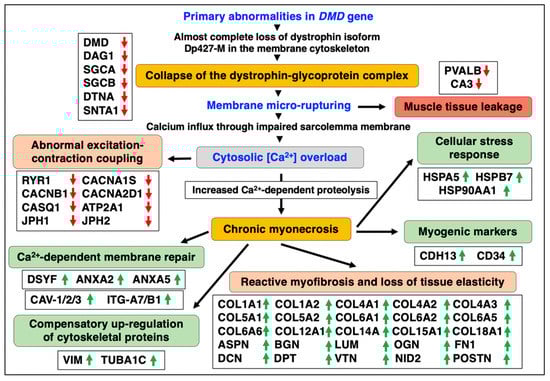 The proteomic evaluation of key proteins involved in the regulation of calcium homeostasis has shown elevated levels of calcium-sensing annexins and a decrease in regulatory components of excitation-contraction coupling. The calcium hypothesis of Duchenne muscular dystrophy assumes that abnormal calcium handling plays a major role in progressive myonecrosis [27]. Full-length dystrophin forms a lattice underneath the sarcolemma in normal muscles, which stabilizes the fiber periphery by linking the actin cytoskeleton to the extracellular matrix via the dystrophin-associated dystroglycan complex [18,20]. The almost complete loss of the Dp427-M isoform in dystrophinopathy weakens this trans-plasmalemmal linkage and renders dystrophic fibers more susceptible to membrane leakage during excitation-contraction-relaxation cycles [28]. The resulting influx of calcium ions, both through membrane tears and calcium leak channels, causes a drastic elevation of the sarcosolic calcium concentration. This in turn activates calcium-dependent proteolysis, which results in the enhanced destruction of muscle proteins [27]. The reduced levels of the voltage-sensing L-type calcium channel of the transverse tubules, the ryanodine receptor calcium release channel and associated junctophilins of the triad junction, the luminal calcium-binding protein calsequestrin and the calcium-pumping ATPase of the sarcoplasmic reticulum agree with the pathophysiological concept of dysregulated calcium fluxes in dystrophin-deficient fibers [28].