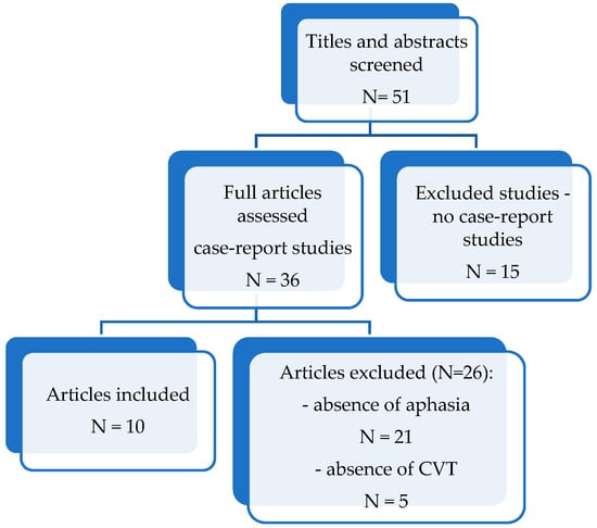 We achieved a literature search in the PubMed database [cerebral phlebothrombosis aphasia-Search Results-PubMed (nih.gov)], from 2012 to 2022 (in the present), using the following search terms: “aphasia” and “cerebral phlebothrombosis”. Our main objective was to identify the incidence of aphasic syndrome, the main characteristics of those syndromes and correlation between clinical picture and localization of cerebral veins or dural sinuses thrombosis. After identifying the articles, we reviewed the abstracts of the papers and made a preliminary evaluation of their eligibility. After this stage, all potentially eligible papers were accessed and read. We included only those papers which met the eligibility criteria and were relevant to our review (Figure 1).