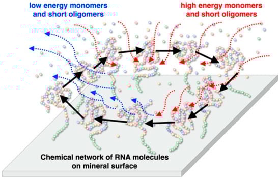 - Mizuuchi, R.; Blokhuis, A.; Vincent, L.; Nghe, P.; Lehman, N.; Baumd, D. Mineral surfaces select for longer RNA molecules. Chem. Comm. 2019, 55, 2090–2093. [Google Scholar] [CrossRef] [PubMed]