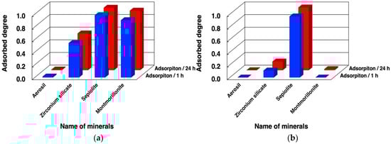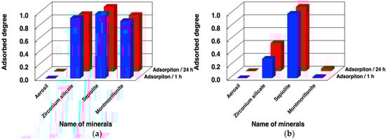 Adsorbed amounts of dna-ASBVd45 on minerals in the presence and absence of MgCl2. Mineral phase/aqueous phase: 20.0 mg/2000 µL, [dna-ASBVd45] = 1.14 µM, [HEPES] = 0.05 M, pH: 7.5, [MgCl2]: (a) 0.05 M, (b) 0 M. Adsorption time: 1 h (blue bars), 24 h (red bars).