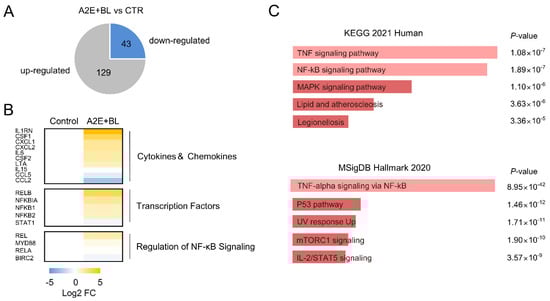 Activation of TNFα signaling by A2E and BL in ARPE-19 cells. (A) RNA-seq of in AREP-19 cells treated with A2E and BL (A2E+BL). The number of DEGs (129 upregulated and 43 downregulated) were shown in the pie chart (|FC| ≥ 2.0, Q < 0.05). (B) Heat map of genes responsible for cytokines and chemokines, transcription factors, and regulation of TNFα signaling. (C) Bar charts of potential signaling pathways generated using DEGs by A2E+BL in ARPE-19 cells. Pathway analyses were performed using KEGG and MSigDB.
