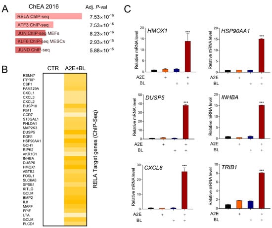 Next, we predicted the regulatory factors of these DEGs using in silico analysis. RELA (p65) was predicted as the most statistically significant upstream transcriptional regulator (Figure 2A). The NF-κB transcription factor exhibits various functions depending on the combination of various homo- and heterodimers. In particular, a heterodimer containing RELA (p65) and c-Rel acts as a transcriptional activator [32]. Indeed, in addition to the genes in the TNFα signaling pathway presented in Figure 1B, the expression levels of many previously reported RELA target genes were upregulated by A2E and BL treatment (Figure 2B). To verify the results of the in silico analysis, the effect of A2E+BL on a representative RELA target gene was confirmed using RT-qPCR in ARPE-19 cells. All six genes (HMOX1, HSP90AA1, DUSP5, INHBA, CXCL8, and TRIB1) confirmed in the experiment showed no change in their expression levels after A2E or BL treatment, but they did show a significant increase in expression with A2E+BL treatment (Figure 2C). These results suggest that photooxidation of A2E by BL activates NF-κB-mediated transcription in ARPE-19 cells.