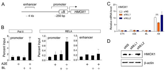 Recruitment of NF-κB and effect of MLL1 in HMOX1 gene expression induced by A2E and blue light (BL). (A) The location of NF-κB binding sites in the HMOX1 promoter region. (B) ChIP (chromatin immunoprecipitation) assay showing the recruitment of RELA (p65) and RNA Pol II to the HMOX1 promoter region after the treatment (+ marked) of A2E, BL, or A2E+BL. The enhancer region lacking an NF-κB binding site was used as a negative control. The occupancies of RELA and Pol II were calculated as a percentage of input. Each value represents mean ± SD, ** p < 0.01). (C) ARPE-19 cells were transfected with siNS (non-specific siRNA), siRNA targeting MLL1 (siMLL1), or siRNA targeting MLL2 mRNA (siMLL2). After 72 h of transfection, total RNA was extracted by TRIzol and analyzed by RT-qPCR, and the mRNA levels of HMOX1 were normalized to that of 18S rRNA. Each value represents mean ± SD (n = 3), ** p < 0.01. (D) Protein levels of HMOX1 in MLL1 or MLL2-depleted ARPE-19 cells measured by Western blotting.