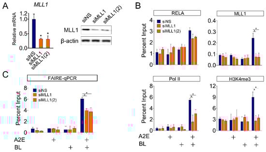 MLL1 histone methylases contribute to the formation of chromatin structures suitable for transcriptional activation [44]. Therefore, we aimed to investigate the role of MLL1 in binding transcription factors and changes in chromatin structure during BL-induced HMOX1 gene expression in ARPE-19 cells. First, two types of siRNAs (siMLL1 and siMLL1(2)), acting on different regions of MLL1 mRNA, were used to reduce the level of MLL1 expression in ARPE-19 cells (Figure 4A). Compared to cells treated with siNS, the occupancy of RELA in the promoter region of the HMOX1 gene, which was increased by BL irradiation, was slightly suppressed in MLL1-depleted cells, but it was not statistically significant (Figure 4B). MLL1 histone methylase contributes to the formation of an open chromatin structure required for transcriptional activation by methylating the H3K4 residue [44]. Correspondingly, the level of H3K4me3 and the binding of RNA Pol II to the HMOX1 promoter region were also significantly reduced by depletion of MLL1. Finally, we monitored changes in chromatin structure in the HMOX1 promoter region following BL irradiation. BL irradiation significantly increased chromatin accessibility of the HMOX1 promoter region, as expected. These changes are consistent with an increase in promoter recruitment of transcription factors, including NF-κB, and co-regulators, including MLL1. In contrast, depletion of MLL1 significantly inhibited the increase in chromatin accessibility induced by BL (Figure 4B,C). These results are consistent and show that MLL1 depletion significantly suppressed the induction of HMOX1 expression by BL (Figure 3C,D). These results suggest that MLL1 plays an important role in H3K4me3 methylation in the HMOX1 promoter region, NF-κB recruitment, and chromatin remodeling.