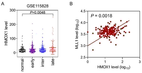 In patients with dry macular degeneration, retinal drusen deposition is a clinical feature [45]. In addition, concerns regarding retinal damage caused by BL are increasing regardless of age because of the explosive increase in the use of smart devices. Therefore, we aimed to determine the clinical relevance of HMOX1 expression in patients with dry AMD. AMD is classified into early-, intermediate-, and late-stage AMD, according to the pattern of drusen accumulation, and the formation of exudative neovascularization in the retina. To compare gene expression levels in the RPE cells of patients with dry AMD, a published transcriptome database (GSE115828) was used [46]. The expression of HMOX1 in RPE cells showed a tendency to increase with symptom severity gradually. RPE cells from patients with late-stage AMD showed a statistically significant (p = 0.0048) increase in HMOX1 expression compared to normal retinal tissues (Figure 5A). In addition, the expression levels of MLL1 and HMOX1 in retinal tissues showed a statistically significant correlation (Figure 5B). These results support our in vitro findings demonstrating that MLL1 regulates HMOX1 expression in RPE cells.