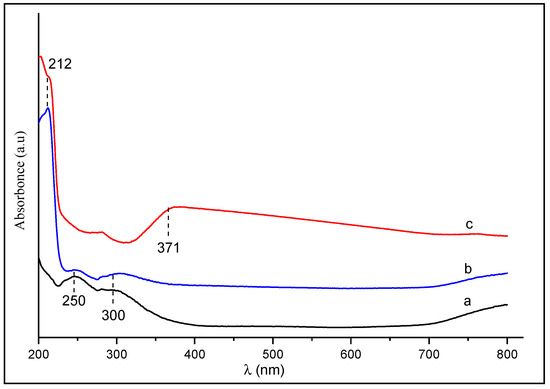 The UV/Vis spectra of Al2O3, HDTMA+ and HDTMA+/Al2O3 composite are shown in Figure 1. In the absence of the polymer, two characteristic bands of γ-Al2O3 are observed at λ = 250 nm and λ = 300 nm (spectrum a). These bands keep their initial positions and decrease in intensities in the spectra (b) of HDTMA+/Al2O3, due to the adsorption of HDTMA+ on the alumina surface. The appearance of a new band at λ = 212 nm can be attributed to electronic transitions of σ → σ*, characteristic of saturated hydrocarbons. However, the wide band observed at λ = 371 nm in the spectra (b) of HDTMA+ corresponds to n → σ* transitions. This band does not appear in the spectrum (c) of the composite, probably because the original electrons are engaged in the interactions between the polymer and alumina.
