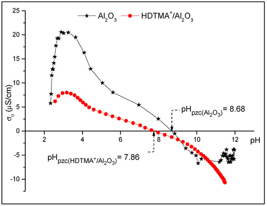 The point of zero charge corresponds to the pH(pzc) where the net number of positive and negative charges are equal and, thus, the total surface charge becomes zero. The pHpzc of Al2O3 and HDTMA+/Al2O3 were determined using the volumetric potentiometric titration method developed recently in our laboratory and detailed in Reference [39]. The potentiometric titrations are carried out at 298 K in a special thermostated cell in the presence of the solids in the solution and in their absence (blanks). Briefly, the procedure is as follows: a mixture of V = 100 mL of NaCl electrolyte (C = 10−3 mol/L) and V = 1 mL of HCl (C = 0.50 mol/L) is titrated gradually by adding a volume of 50 ± 0.005 µL of NaOH solution (C = 0.2 M) to the mixture. The assay is stopped after each addition of NaOH when there is no variation in the pH final (pHf) of the solution. Then, the density of surface charge (σ0) is calculated as a function of pHf. The titrations of solids are carried out in the same way as in their absence.