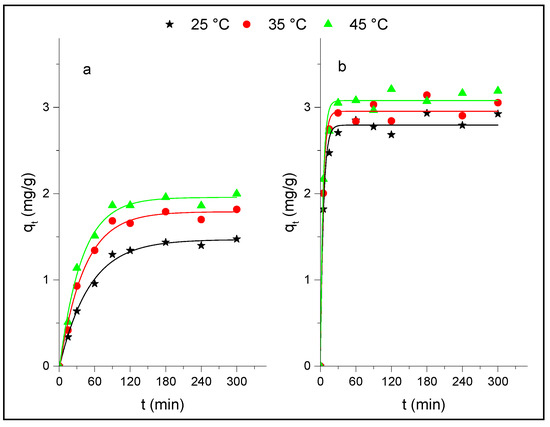 The study of adsorption as a function of time makes it possible to obtain information about the kinetic parameters involved in the process. Figure 5 shows the obtained kinetic curves for p-NP adsorption onto Al2O3 and HDTMA+/Al2O3 at T = 25, 35 and 45 °C, and at a constant pH = 6. These kinetic curves clearly showed that initial adsorption of p-NP on the composite occurred quickly during the first contact time (t < 30 min) at all temperatures studied, compared to its adsorption on alumina (t > 60 min). After these times, the removal of p-NP does not show a noticeable evolution, which indicates that the equilibrium times are reached. In addition, it is noted that the equilibrium uptake of p-NP onto the two adsorbents increases with the adsorption temperature and at the same temperature the adsorption capacity of the composite is greater than that obtained in the case of Al2O3 alone, due to the presence of HDTMA+ on the surface of Al2O3, which gives the composite a large number of sites available for the adsorption of p-NP. For example, for T = 45 °C, the adsorbed amounts of p-NP at equilibrium are qe = 3 mg/g and 2 mg/g for the composite and alumina, respectively. This behavior can be related to the nature of the interaction involved in the adsorption process. Indeed, at pH = 6, p-NP exists in the solution in its neutral form and is less ionized to phenolate, given its pKa value (pKa = 7.15), and the adsorbent surfaces are always positively charged (pHpzc > 6). Moreover, it has been observed that p-NP does not adsorb at pH > 7 [43,44,45,46], which suggests that different forces other than the electrostatic forces can be involved in the adsorption of p-NP. It was indicated that the π-π stacking interaction between benzene rings of nitrophenol and the surface of the adsorbents might be the plausible route for the adsorption of p-NP. Furthermore, a comparison of the adsorbed amounts of p-NP at equilibrium with those obtained in our previous study for the adsorption of ortho-NP and meta-NP isomers on these solids, under the same experimental conditions [14,15], shows that p-NP adsorbs less (o-NP > m-NP > p-NP), indicating that the polarity of nitrophenlic compounds, which depends on the position of the nitro groups. This suggests that they also play an important role in their adsorption. Other authors [47,48], have found that molecular p-NP can be adsorbed onto graphene oxide at a lower pH by hydrophobic and π-π interactions with the aromatic moieties of the p-NP and the aromatic matrix of the graphene. This mechanism corresponds to the well-known donor−acceptor complexes. The increases in the adsorbed amount of p-NP onto HDTMA+/Al2O3 could also combine the nitrophenols through the hydrogen bonds originating from the amino groups [49]. However, the removal efficiency of p-nitrophenol increased as the temperature increased, indicating that the adsorption of p-NP on both solids is endothermic, which may be due to the changes in the pore structure of the adsorbent and/or the diffusive mass transfer.