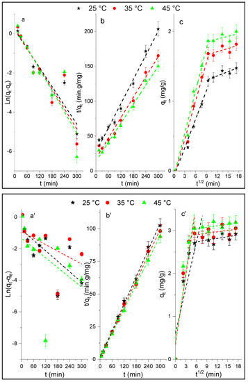 In order to obtain information regarding the kinetic parameters and mechanism of the p-NP adsorption onto Al2O3 and HDTMA+/Al2O3, experimental points given in Figure 5 were fitted using the linear kinetic models of pseudo-first order, pseudo-second order, and intra-particle diffusion. Figure 6 presents the corresponding plots, respectively, and the calculated kinetic parameters are given in Table 2. Figure 6(a,a’) showed that the linear pseudo-first order (LPFO) kinetics do not provide a straight line in the ranges of time and temperatures studied for both adsorbents, unlike the pseudo-second order (LPSO) model (Figure 6(b,b’)), which allows for a better fit of the experimental data. The validity of this model is confirmed by a good agreement obtained between the calculated and experimental values of qe, and the accuracies of different kinetic parameters (values of R2, Δq, and χ2 in Table 2). In addition, using the nonlinear equation (qe vs. t) of this model (NLPSO) also leads to a good representation of the experimental data (curves in Figure 4). The values of rate constants k2 were found to increase as the adsorption temperature increases.