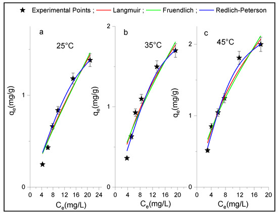 Adsorption isotherms of the p-NP on Al2O3 at (a) T = 25 °C, (b) T = 35 °C and (c) T = 45 °C plotted at each temperature with non-linear regression of the Langmuir, Freundlich, and Redlich-Peterson models.