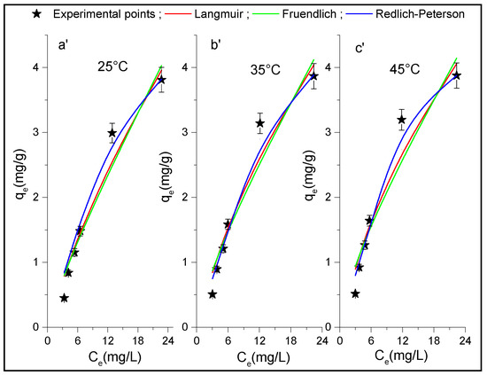 Adsorption isotherms of the p-NP on HDTMA+/Al2O3 at (a’) T = 25 °C, (b’) T = 35 °C and (c’) T = 45 °C plotted at each temperature with non-linear regression of the Langmuir, Freundlich, and Redlich-Peterson models.