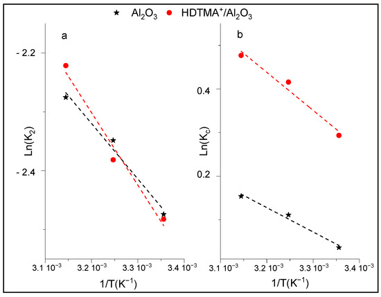The thermodynamic parameters, such as activation energy (Ea), Gibbs free energy (ΔG°), enthalpy change (ΔH°), and entropy change (ΔS°), are useful to determine the spontaneity of p-NP adsorption onto Al2O3 and HDTMA+/Al2O3. The activation energy (Ea) was evaluated from the slope of the linear form of the Arrhenius equation (Table 1), which expresses the pseudo-second order rate constant K2 as a function of adsorption temperature. According to Figure 9a, a linear plots of ln(K2) vs. (1/T) were obtained for both adsorbents in the temperature range studied (283–313 K). The activation energies of p-NP adsorption are Ea = 8 kJ/mol and Ea = 10 kJ/mol for Al2O3 and HDTMA+/Al2O3 (Table 4), respectively, indicating that the adsorption is an endothermic process, and likely dominated by physical adsorption (Ea < 40 kJ/Mol), involving weak attraction forces. Other considered thermodynamic parameters were also determined by plotting the linear form of the van’t Hoff equation (ln(Kc) vs. (1/T) (Figure 9b), which led to the values of ∆H° and ∆S°, as listed in Table 4. Thus, the positive values of ∆H° (0 < ∆H° < 10 kJ/mol) and ∆S° show that the adsorption of p-NP on the adsorbents is endothermic and that the adsorbed species are disordered at the solid-liquid interface. The values of ∆G° were negatives, indicating that the adsorption of p-NP is spontaneous at all temperatures studied. This finding confirmed the previous results, mainly the increase in the p-NP adsorption capacities of adsorbents as the temperature increased, as well as the physical nature of the adsorption process. Additionally, the values of ∆H° indicated that p-nitrophenol has more energy when adsorbed onto HDTMA+/Al2O3 compared to Al2O3.