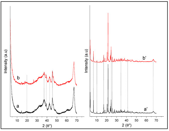 XRD patterns of (a) Al2O3 and (b) p-NP/Al2O3 and (a’) HDTMA+/Al2O3 and (b’) p-NP/HDTMA+/Al2O3.
