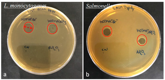 Inhibition zone of HDTMA+-Br− and HDTMA+/Al2O3 against (a) Listeria monocytogenes, and (b) Salmonella spp.