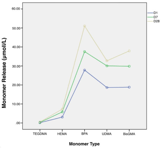 Bis-GMA is a monomer usually added to the structure of resin composites. It reduces polymerization shrinkage, increases mechanical properties, and provides a high level of bonding to enamel [40]. However, it has a low degree of conversion and high viscosity. [36] This study determined that Bis-GMA is generally released at a high rate, similar to previous studies [23,24,41]. This may be due to the generally low conversion of the double bonds of Bis-GMA [39,41] or to the fact that it shows a continuous and significant release, as it is a hydrophobic monomer with similar solubility parameters to ethanol, a non-polar organic solution [4,41].