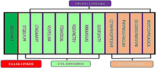 Vaccination remains an urgent need to control and eliminate SARS-CoV-2. The use of immunoinformatic tools in the design of vaccines against diseases is cost-effective and convenient. In silico approaches have paved the way to design immunogenic and highly conserved epitopes from viral antigens [12,13,14]. Epitope-based vaccines have many advantages over those produced by conventional methods. They are easier, faster to produce, and do not require microbial culturing. Multi-epitope vaccines do not contain the whole virus, so they are safer, more specific, and more stable. Finally, the design of promiscuous T cell epitopes can bind to multiple alleles inside human population that will ensure the expected immune response among a heterogeneous human population [14]. Many studies have generated epitope-based peptide vaccines of SARS-CoV-2. The multi-epitope vaccine can provoke cellular and humoral responses in human hosts [15,16,17,18].