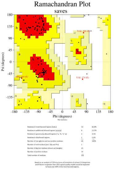 - Wiederstein, M.; Sippl, M.J. ProSA-web: Interactive web service for the recognition of errors in three-dimensional structures of proteins. Nucleic Acids Res. 2007, 35, W407–W410. [Google Scholar] [CrossRef] [PubMed]