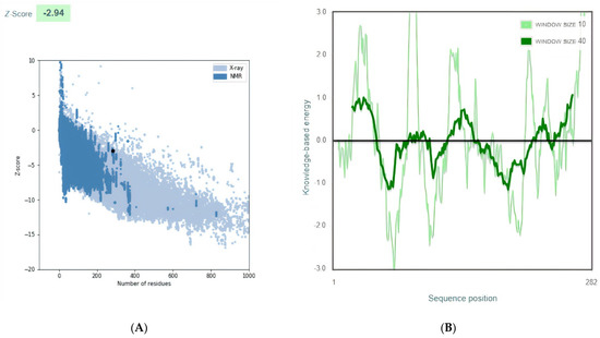 The final multi-epitope vaccine model structures were validated by using ProSA-web. The overall Z-score was −2.94 for the refined model). Negative z-score values indicate no error parts inside the model structure. This score indicates acceptable model quality as it is within the range of the comparable sized native proteins (Figure 3A). The residue scores were checked (Figure 3B)