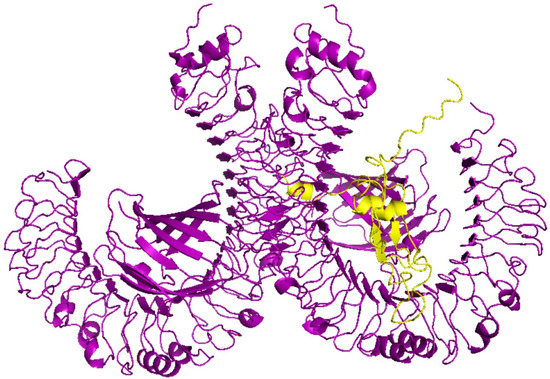 Molecular docking of the vaccine and the TLR4 (PDB ID: 4G8A) immune receptor. Complex of TLR4 (PDB ID: 4G8A) immune receptor in violet and the vaccine in yellow is shown. The score of this complex model is −1346.3, indicating high binding affinity.