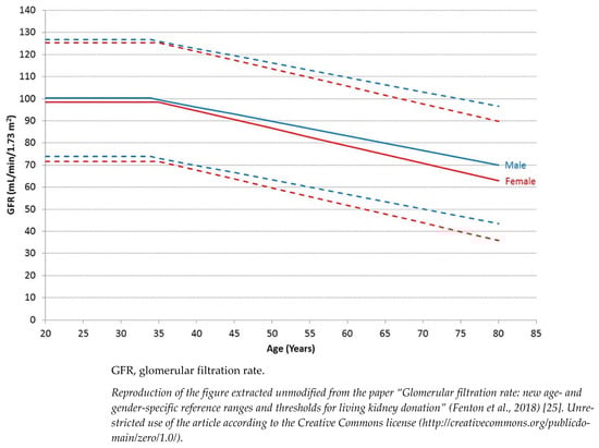 - Fenton, A.; Montgomery, E.; Nightingale, P.; Peters, A.M.; Sheerin, N.; Wroe, A.C.; Lipkin, G.W. Glomerular Filtration Rate: New Age- and Gender- Specific Reference Ranges and Thresholds for Living Kidney Donation. BMC Nephrol. 2018, 19, 336. [Google Scholar] [CrossRef] [PubMed]